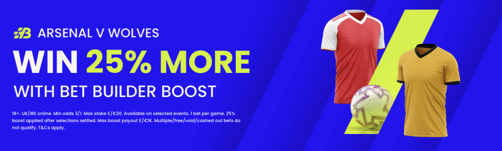For this Bet Builder, we’re backing Arsenal to win to nil, Bukayo Saka to score, and Joao Gomes to be booked, which combine to form 13/2 with BOYLE Sports, who are also offering a 25% Winnings Boost on top.